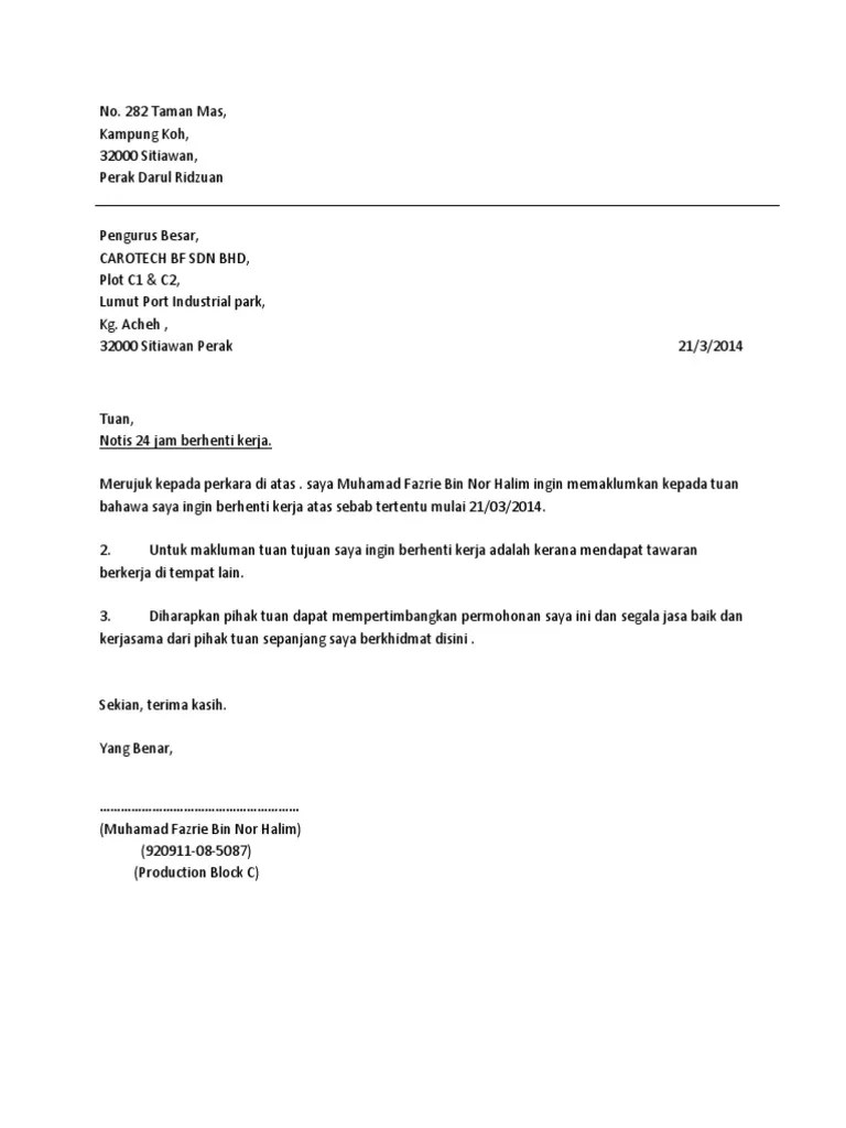 Savesave contoh surat berhenti kerja notis sebulan for later. Untuk sambung pengajian aku pada tahap diploma pulak. Berikut ialah contoh surat berhenti kerja kerana telah mendapat tawaran di tempat lain, dengan notis 24 jam. Merujuk kepada perkara di atas, saya ahmad farhan bin ahmad fuad, ingin memaklumkan kepada pihak tuan bahawa saya akan berhenti kerja mulai 31hb may 2010. Example of a letter of termination. Anda ingin membuat surat perletakan jawatan atau berhenti kerja? Contoh surat rasmi berhenti kerja terbaik yang mudah dan ringkas. Surat rasmi behenti kerja atau resignation letter bagi notis sebulan, seminggu ataupun 24jam? Download contoh surat berhenti kerja notis sebulan. Contoh surat berhenti kerja notis sebulan. Anda sedang mencari contoh format surat notis berhenti kerja yang betul? Beberapa poin penting yang perlu tercantum dalam surat berhenti kerja notis satu bulan, yaitu tuliskan tanggal efektif pengunduran diri (dimulainya berhenti kerja). Namun dikarenakan satu dan lain hal, suatu perusahaan bisa saja memberhentikan karyawan mereka dari pekerjaan.